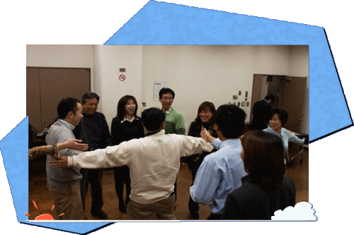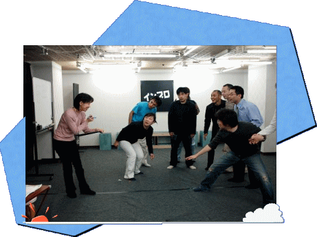 | ■インプロ・ゲームで チームビルディング お互いに協力しあい、職場の上下関係を超えたコミュニケーション力を養います。インストラクターの指導の元、全員で様々なインプロ・ゲームを行います。楽しく、気軽に、親ぼくを深めお互いの理解深めることができます。 体を使うゲームと頭を使うゲームをバランスよくとりいれた、もっともポピュラーなプログラムです。 |